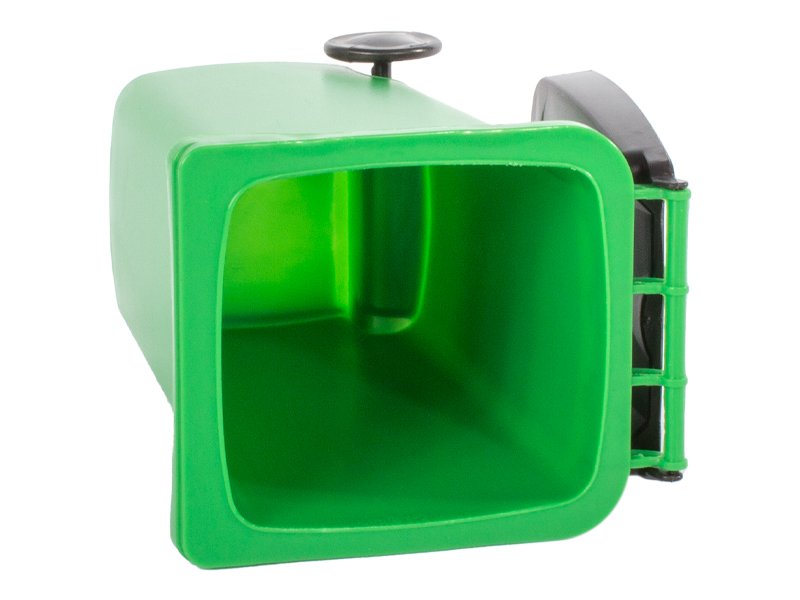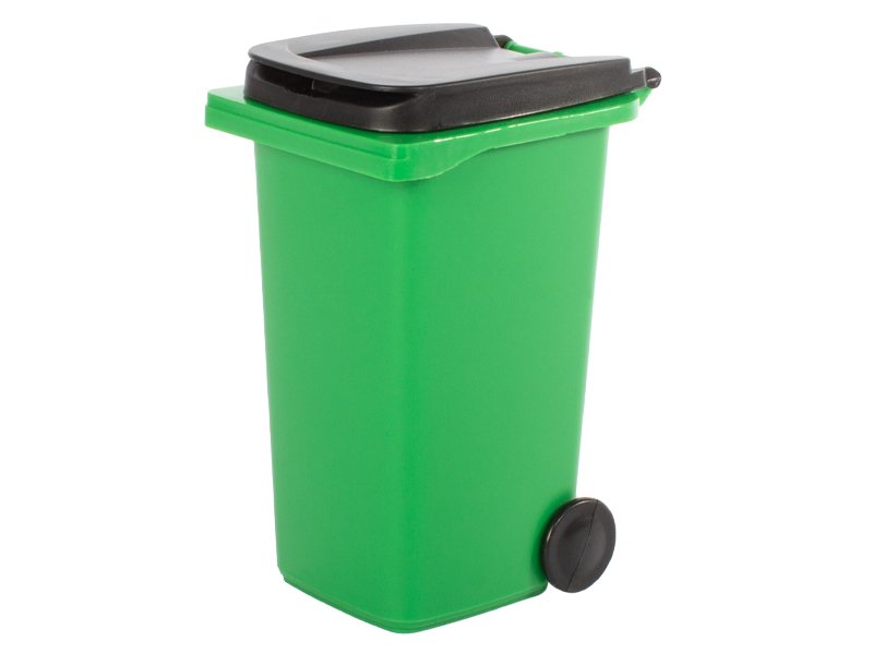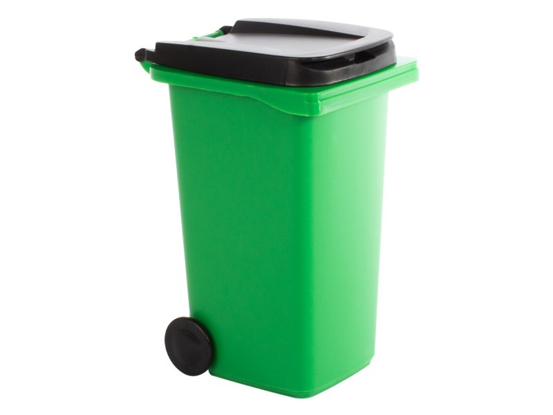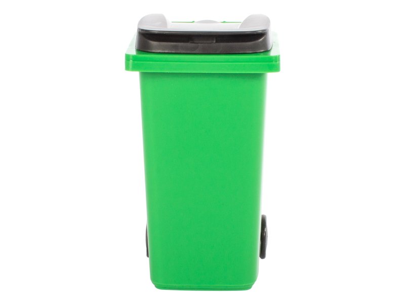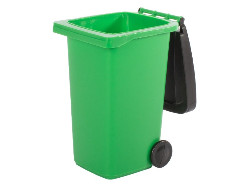 Mini Basurero Verde de Sobremesa plástico verde, con tapa y ruedas negras.