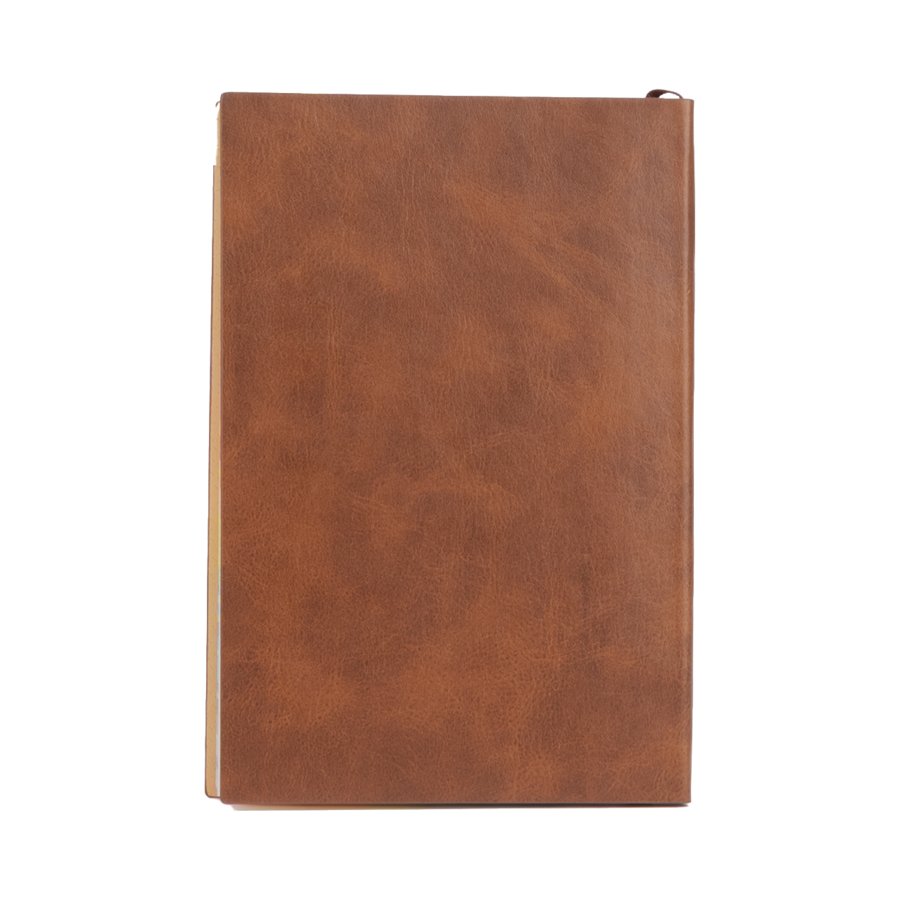 Agenda – Memo con tapas duras forradas en PU eco-cuero café, modelo «THOMSON». interior con 88 finas hojas amarillo Ivory: 8 hojas con Calendarios 2025 – 2026 – 2027, Códigos Discado Directo Nacional e Internacional, Agenda telefónica + 80 hojas lineadas para anotaciones. Lomo pintado multicolor y banda separador de hojas color marrón.