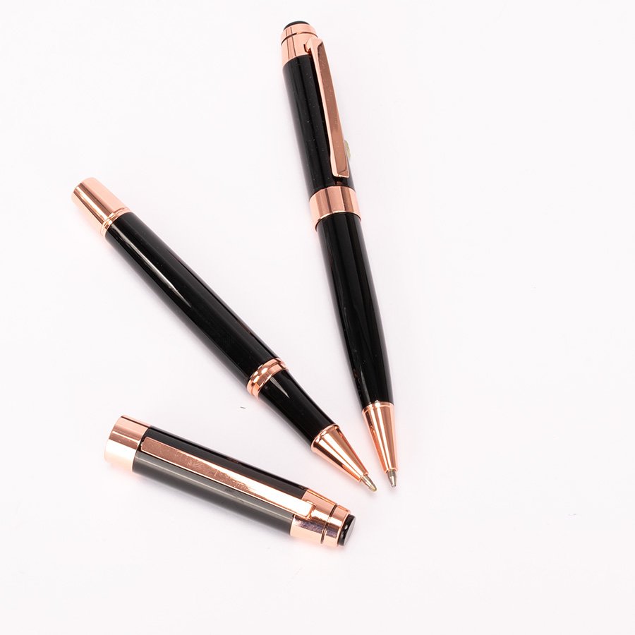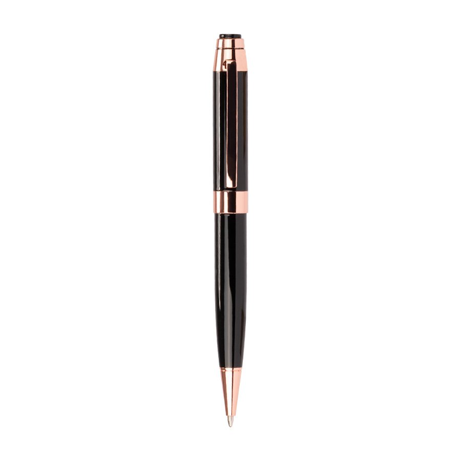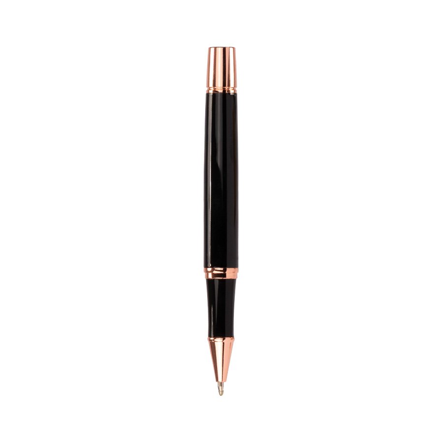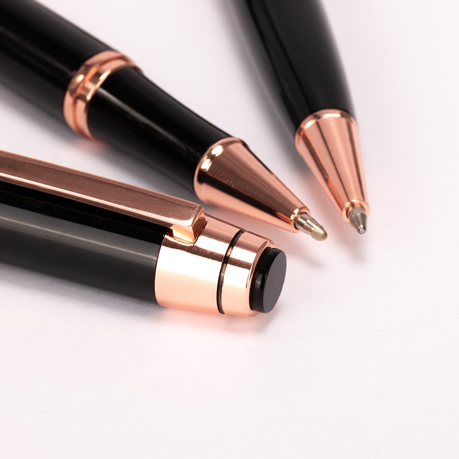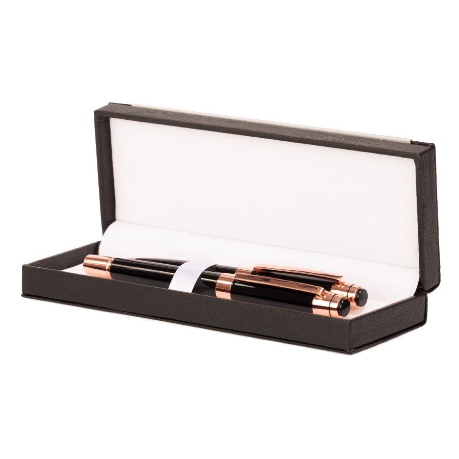 Set de Escritura «THORTON», incluye Bolígrafo metálico negro con terminales encobrizados + Roller pen metálico negro con terminales encobrizados.