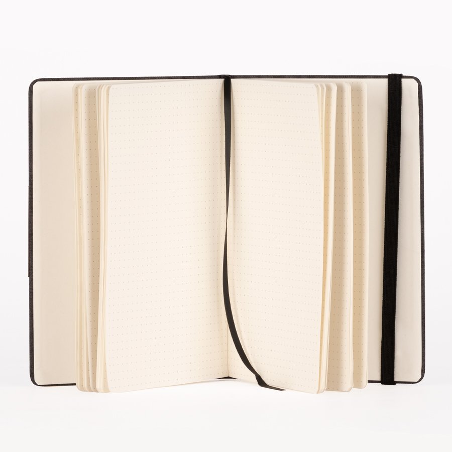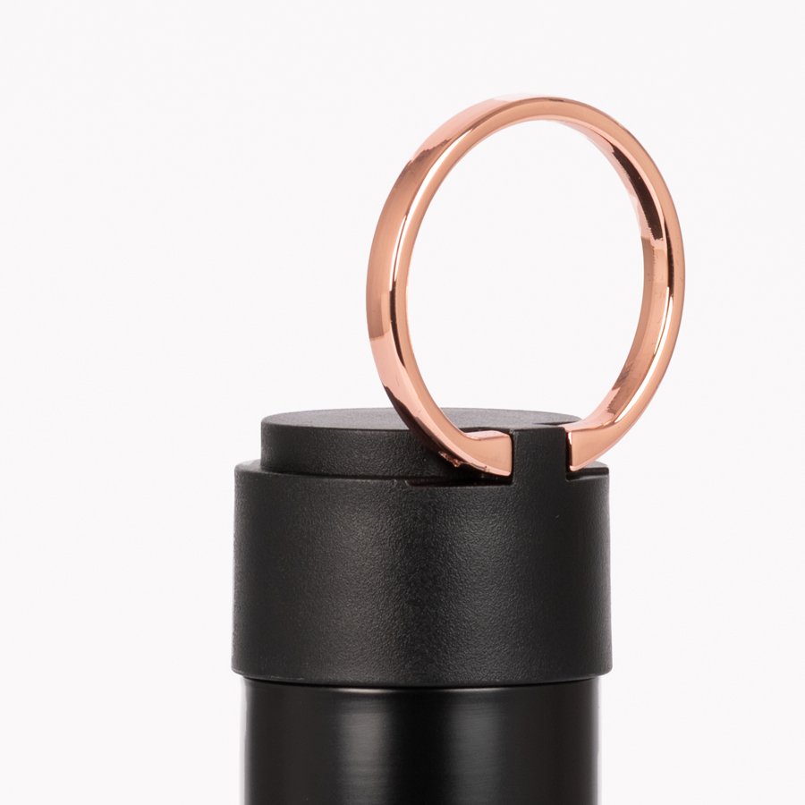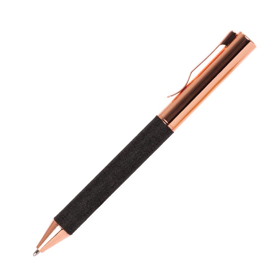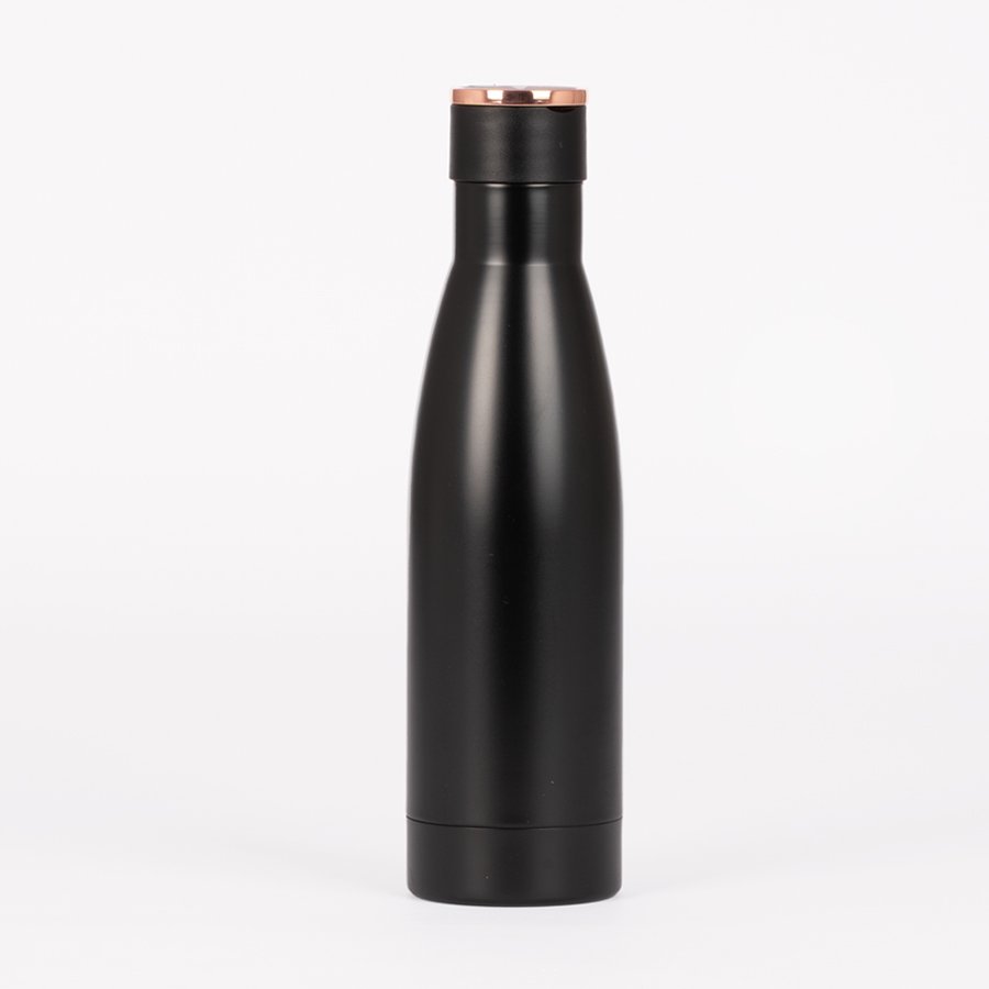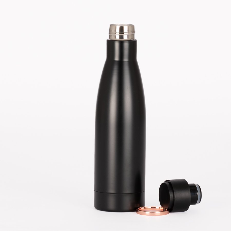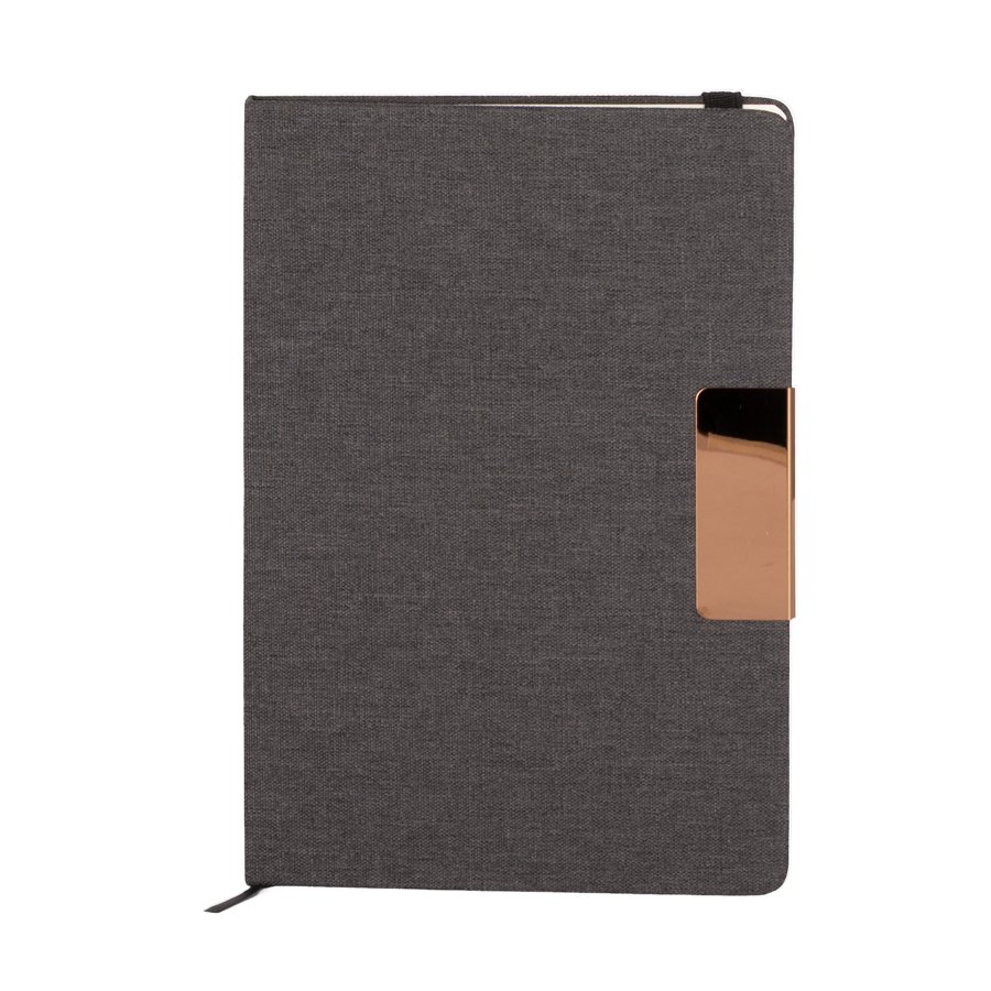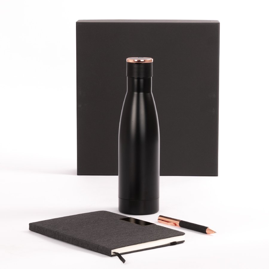 Set de Regalo incluye Termo 550 cc. producto BPA FREE, para el contacto con líquidos y alimentos, con tapa twist-off y asa redonda encobrizada + Cuaderno tapa dura recubierta en tela Oxford negro, con cierre elasticado y detalle metálico encobrizado, interior 80 hojas punteadas (dotted) color ivory (hueso) + Bolígrafo metálico encobrizado con tela Oxford negra, escritura negra .