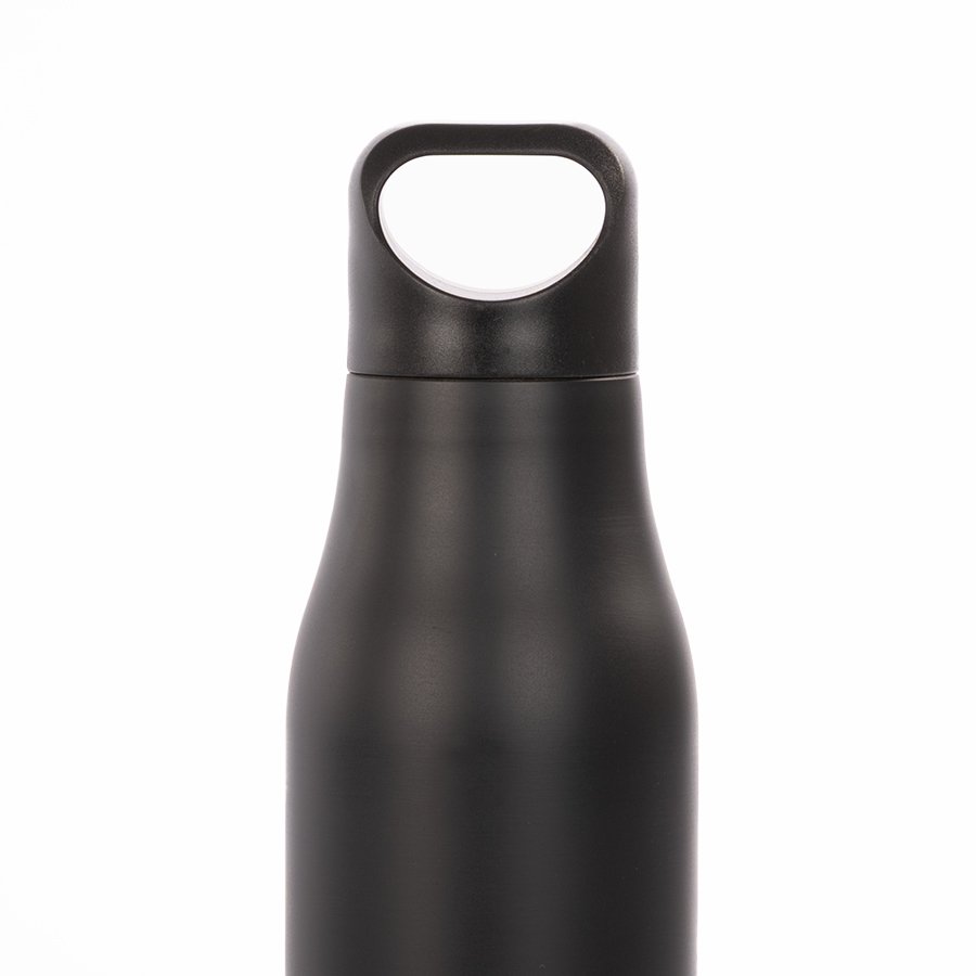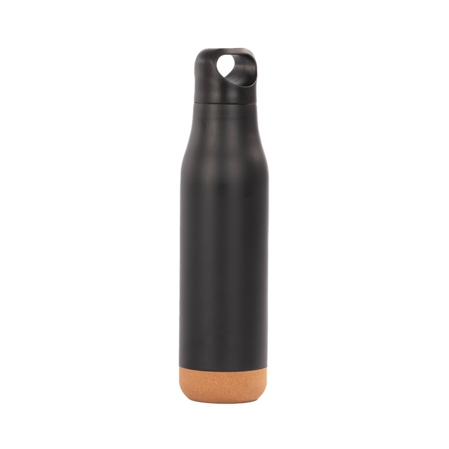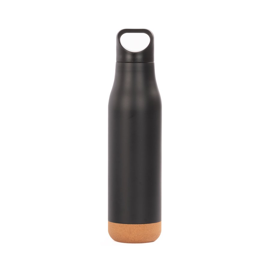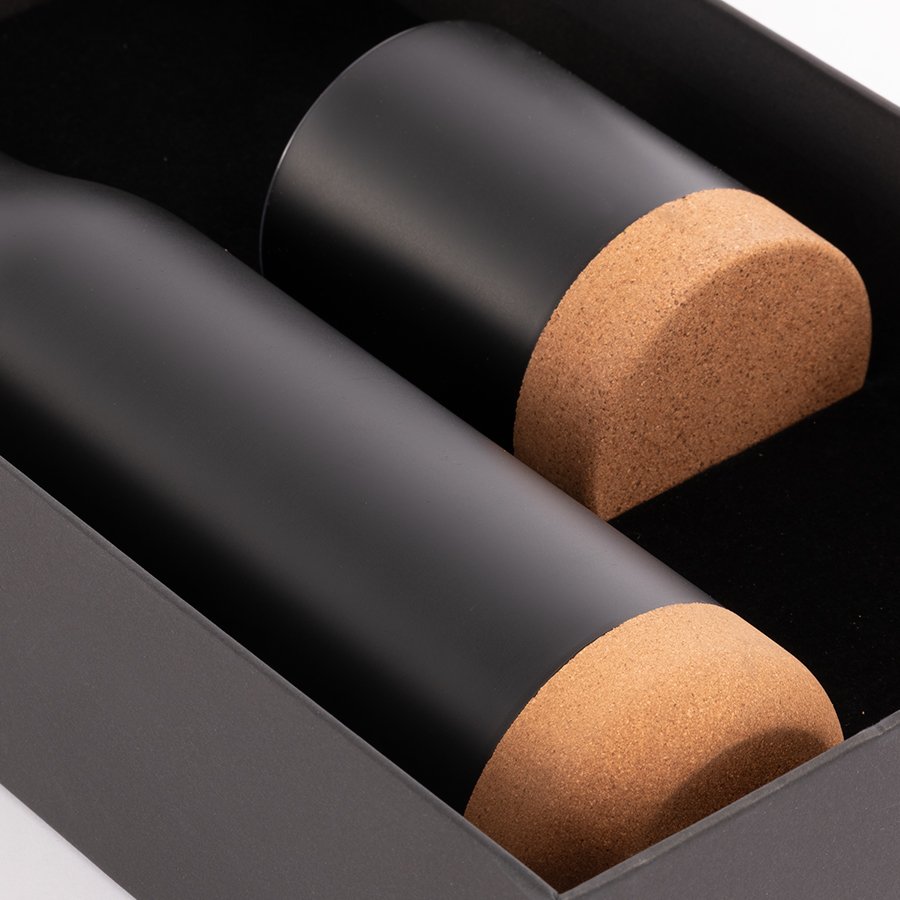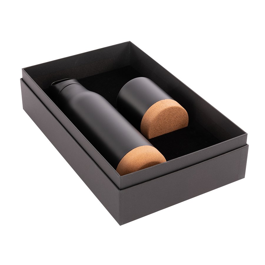 Set de Termo 1/2 litro con tapa twist-off con asa + Mug 200 cc con tapa removible de plástico PS Crystal Clear con sello cilíndrico de silicona, ambos en Acero Inoxidable color negro, con base aislante de corcho, para una mejor adhesión a la superficie. Producto BPA FREE, para el contacto con líquidos y alimentos.