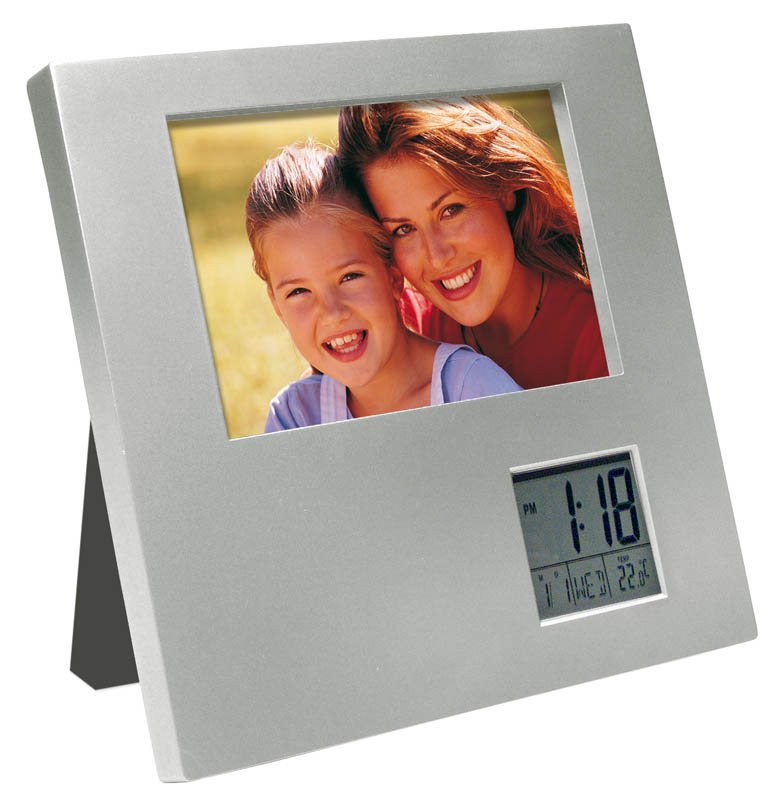 Porta-Retrato de Escritorio para foto de 13 x 9 cm con Estación Meteorológica Digital, incluye Reloj-Alarma-Calendario-Termómetro. Posición Horizontal o Vertical.