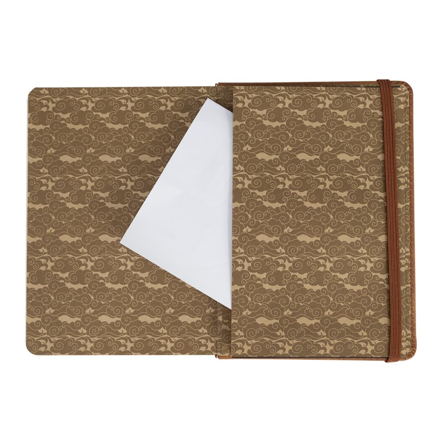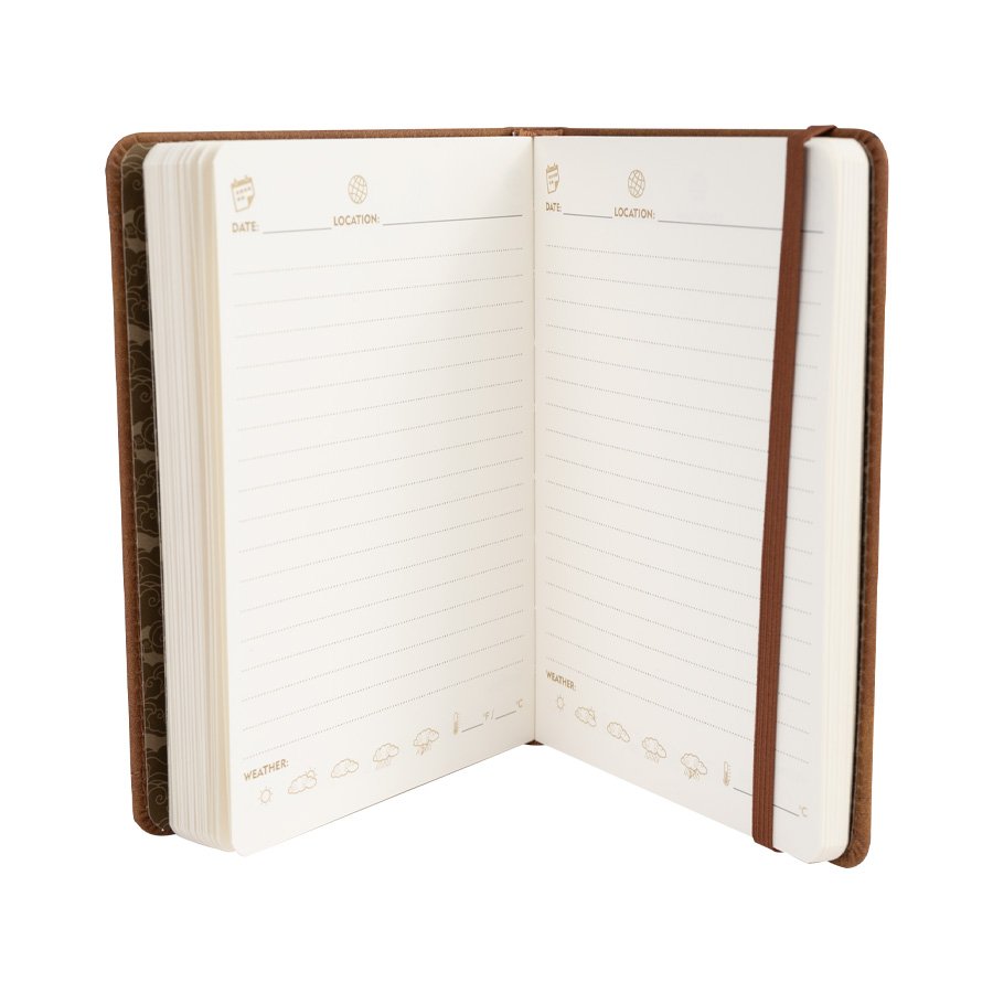 Agenda de Viaje tamaño B6 modelo «TRAVEL JOURNAL», con tapas duras forradas en PU eco-cuero, interior 90 finas hojas amarillas lineadas, con datos relevantes para tus viajes. Contiene elástico para cierre. Y banda separador de hojas color marrón.
