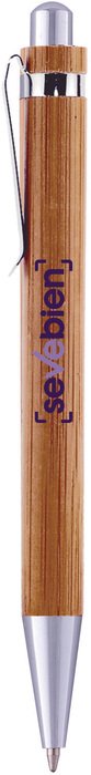 Madera de bambú. Cuerpo de madera. Pulsador y puntera plásticos color plata. Clip metálico. Tinta azul.