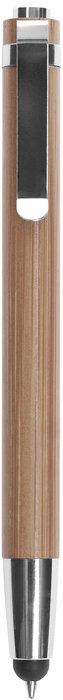 Bolígrafo de bambú con clip metálico. Puntera touch y tinta azul.