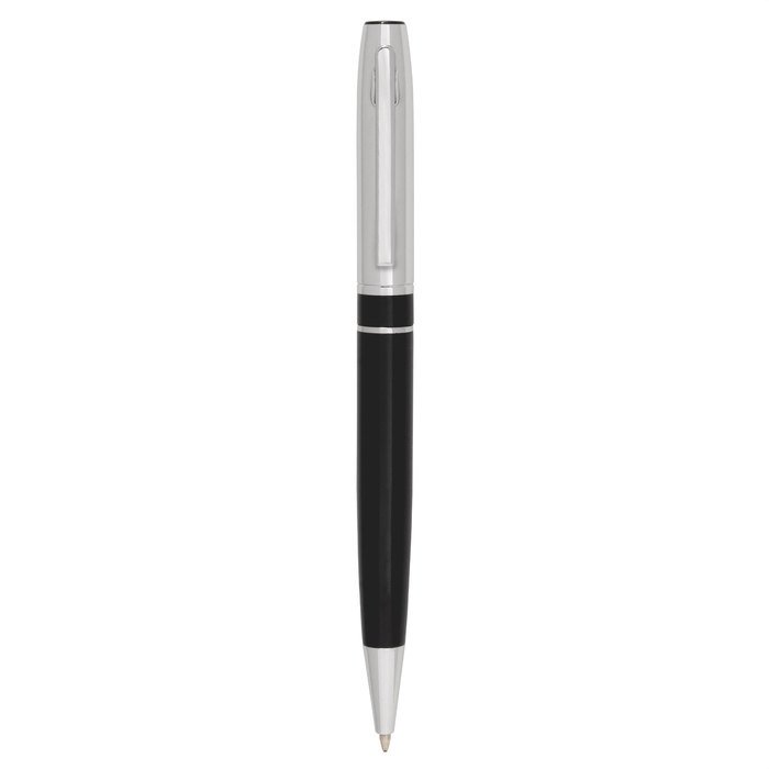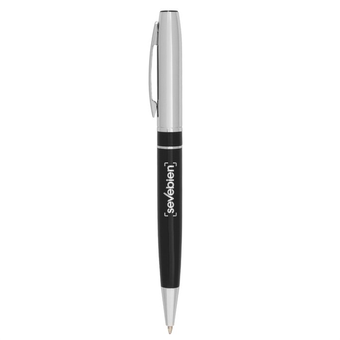 Metálico. Cuerpo color negro. Tambor superior, clip, anillo y puntera color plata. Apertura giratoria. Destape plata en la parte superior e inferior. Tinta azul. Presentación en caja de regalo.