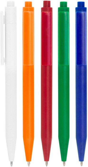 Plástico ABS. Bolígrafo retráctil. Cuerpo y clip plásticos del mismo color, cuerpo acabado mate y clip acabado brillante. Tinta negra. Amplia área de impresión.