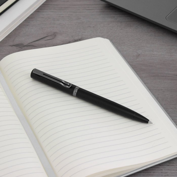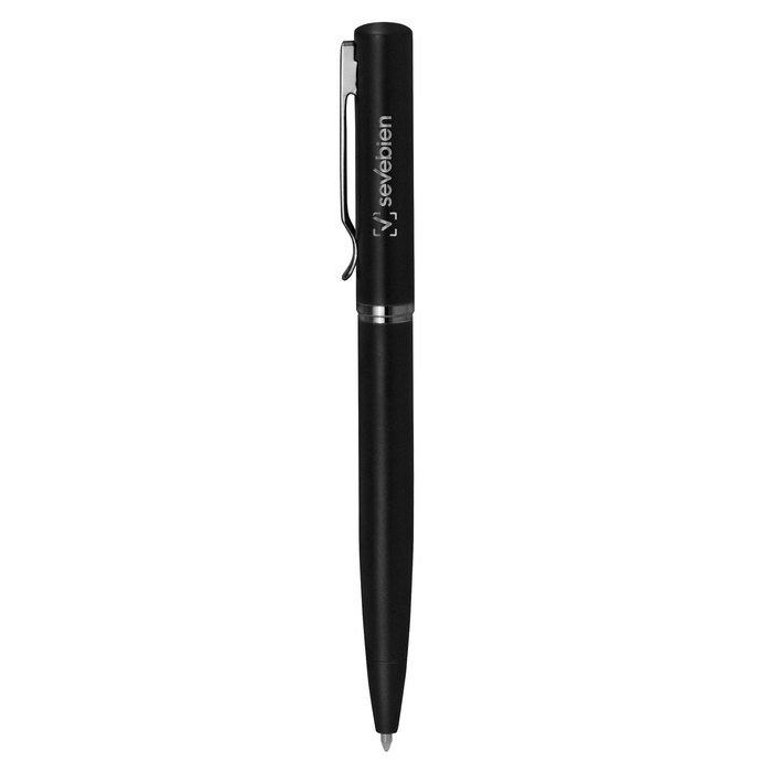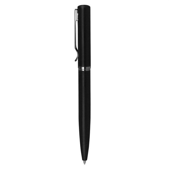 Bolígrafo con apertura giratoria. Cuerpo metálico en negro mate. Parte superior de hierro y parte inferior de acero inoxidable. Destape electroplateado en la parte superior. Recarga Parker metálico. Clip y anillos metálicos color gun.