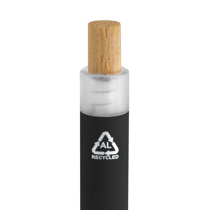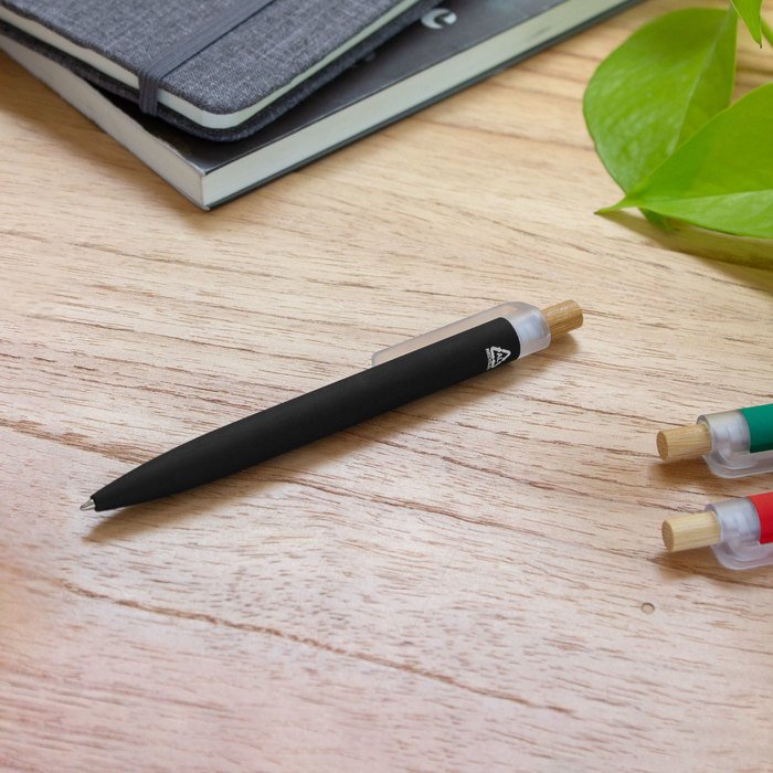 Bolígrafo retráctil. Cuerpo de aluminio en diferentes colores, acabado mate engomado, muy suave al tacto. Botón pulsador de bambú. Clip plástico transparente con terminación frosty.