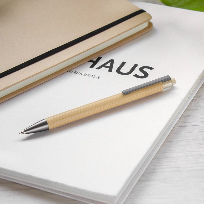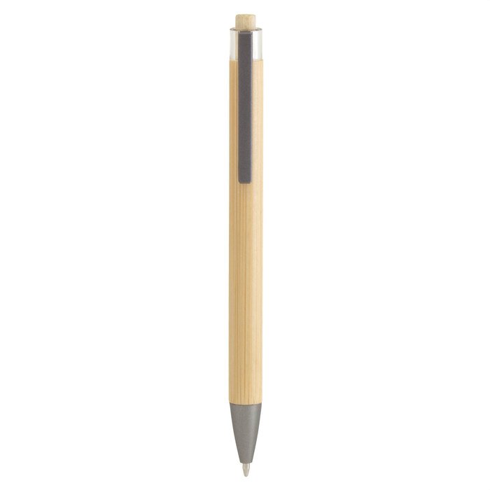 Bolígrafo retráctil. Cuerpo y botón pulsador de bambú. Clip metálico y puntera plástica en color gris gun.