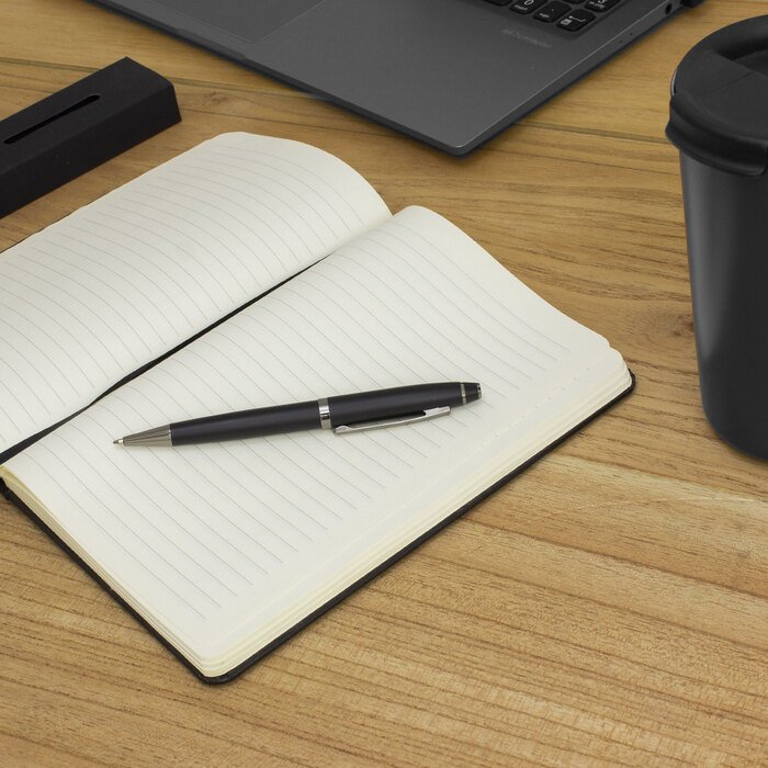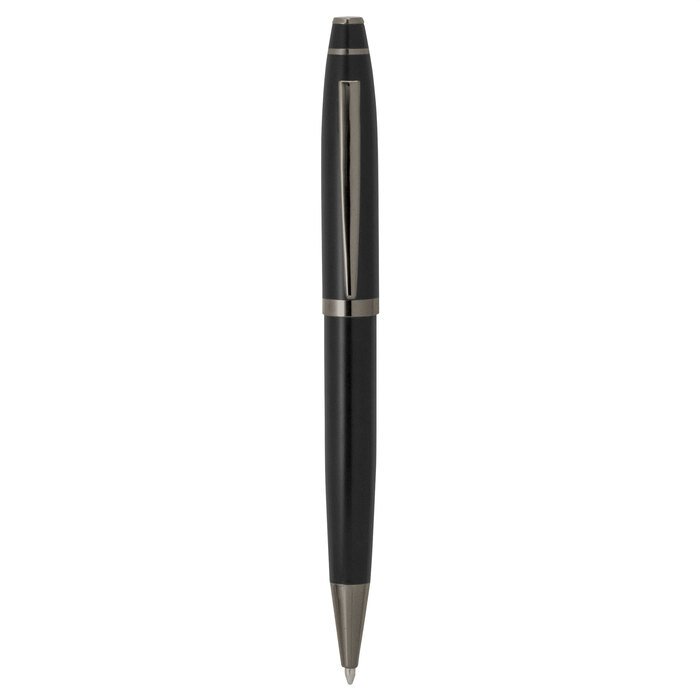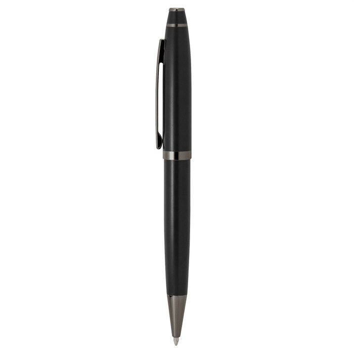 Bolígrafo con apertura giratoria. Cuerpo de acero inoxidable de color con acabado mate. Clip, anillos y punteras metálicos color gun. Destape plata. Recarga metálica.