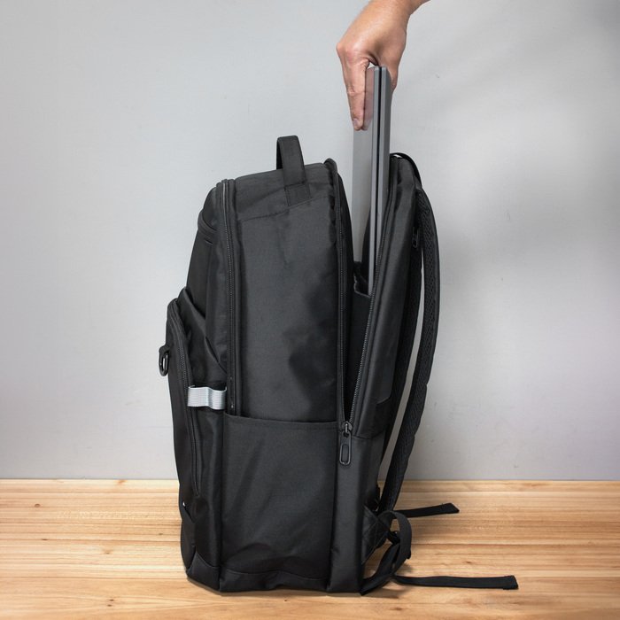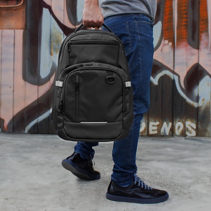 Mochila portanotebook de hasta 16 pulgadas. Cuenta con tres compartimentos: Compartimento posterior con bolsillo acolchado portanotebook con cierre de velcro y bolsillo plano. Amplio compartimento principal con bolsillo externo con cierre horizontal afelpado portagafas. Compartimento frontal con múltiples bolsillos para accesorios y mosquetón plástico portallaves en su interior, exterior con detalle en poliuretano y ribete reflectante, cierre impermeable vertical y gancho porta accesorios. Dos bolsillos laterales portabotellas o accesorios. Asa superior reforzada. Correas ajustables y respaldo acolchados. Tira para sujetar la mochila en la manija extensible de un equipaje de mano. Tiradores de cierres metálicos.