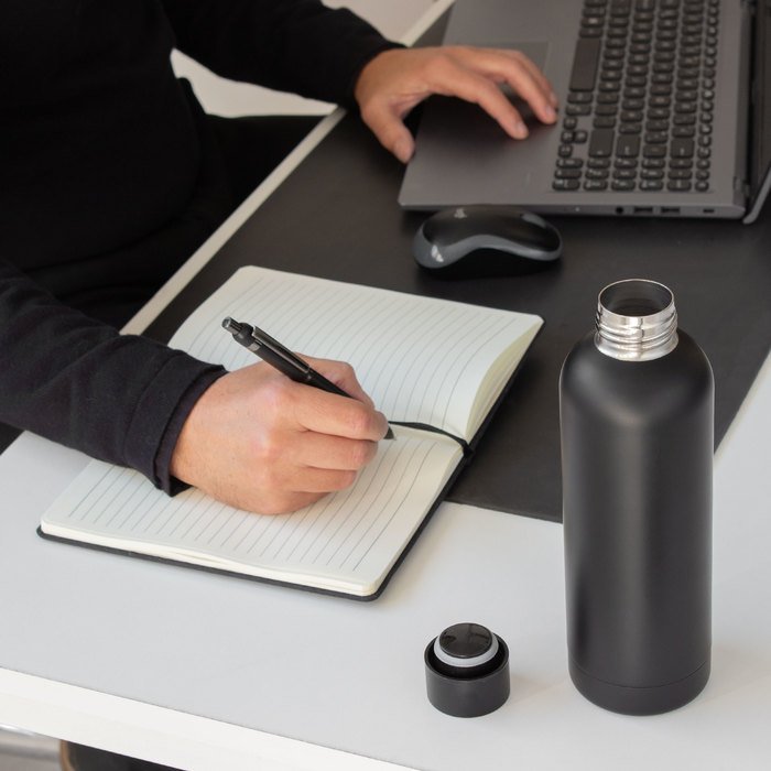 - 1 botella térmica color negro mate de 7,4 x 22 cm. y 500 ml. Doble pared, sellada al vacío. Tecnología vacuum. Interior en acero inoxidable 304 y exterior en acero inoxidable 201. Tapa a rosca de acero con anillo de silicona.