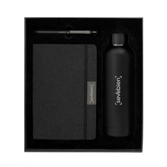 - 1 libreta color negro de 14 x 21 x 1,5 cm. Con placa metálica color gun de 5 x 2 cm. Tapa de cartón 300g recubierta en RPET 310. Interior de 80 hojas rayadas de 70g. Encuadernación cosida y cierre con banda elástica color negro.