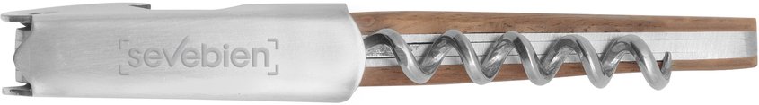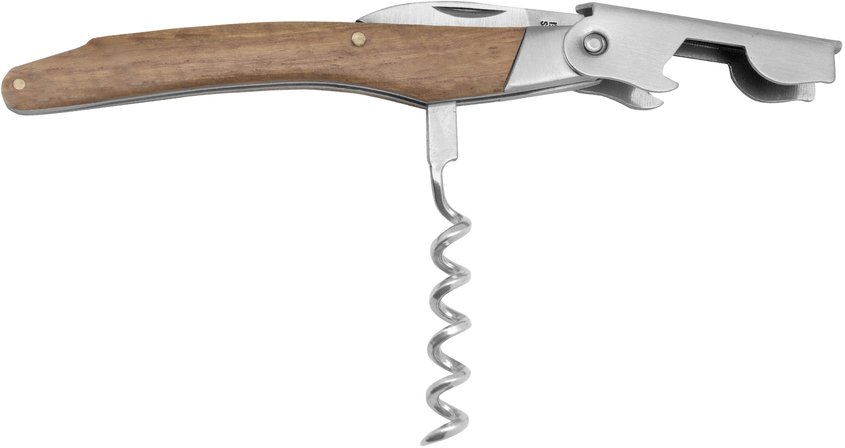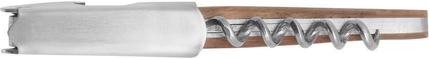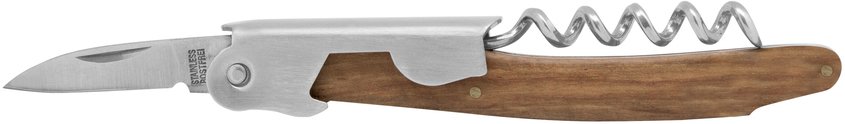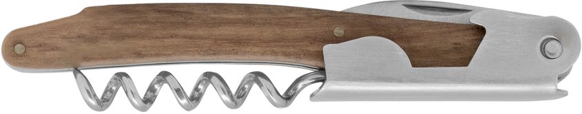 11,6 cm. Acero inoxidable. Peso: 68g. Abridor de botellas de vino en acero inoxidable con mango de madera en color natural. Accesorios incorporados: sacacorchos, navaja y destapador. Presentación en caja de regalo.