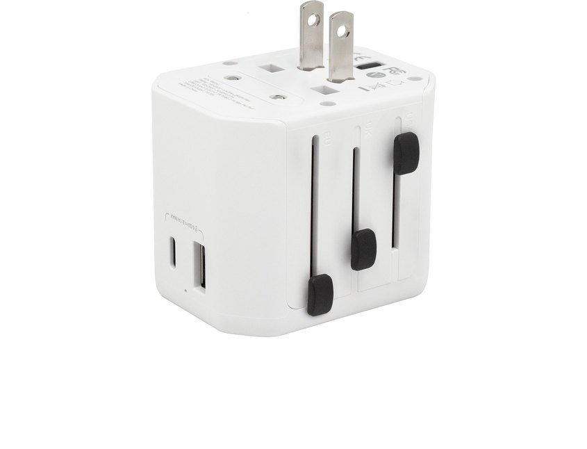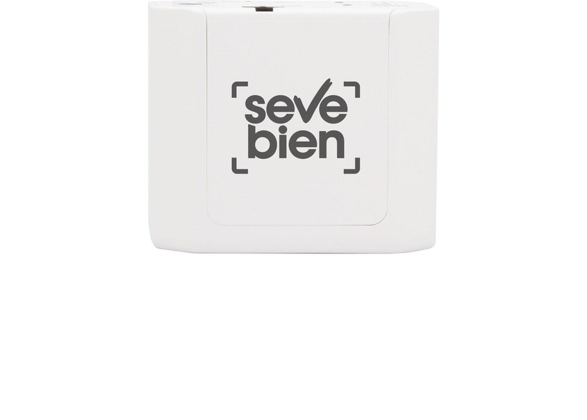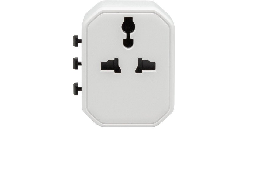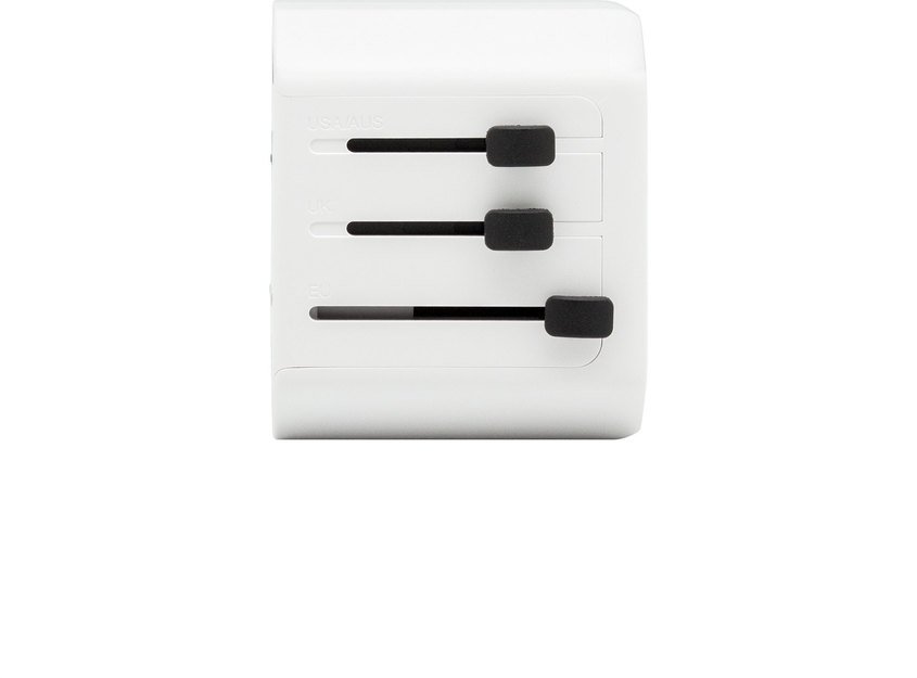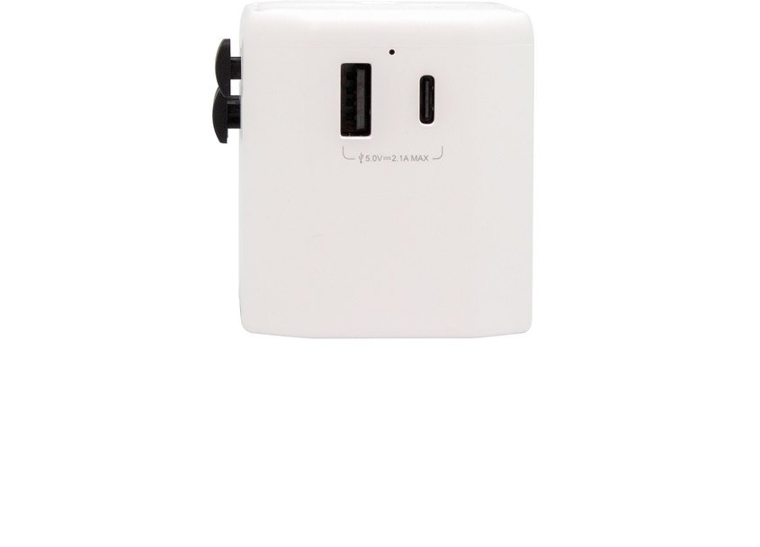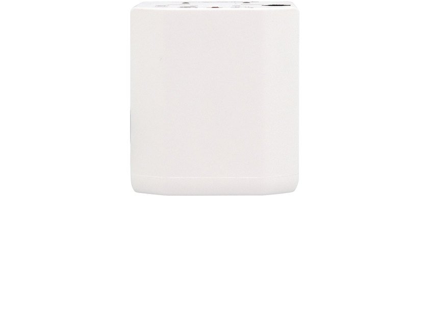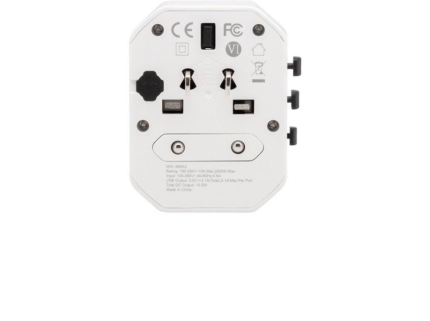 6,5 x 5,5 x 5,5 cm. Plástico ABS. Adaptador universal de viaje. Tipo de puertos: Americano y Europeo. Tipo de patas: redondas, cruzadas y paralelas. Toma múltiple. Puertos USB y USB C. Indicador led. Potencia: 100-250V, 10A MAX, 2500W MAX. Entrada: 100-250V, 50-60 HZ, 0.5A. Salida total usb: 5V/2.1 A, 2.1A máximo por puerto, Salida total DC: 10.5 W. Función CARGA RAPIDA, Presentación en caja de regalo kraft.