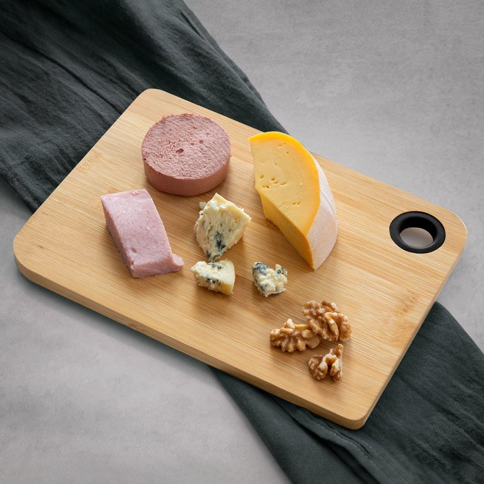 24,7 x 17,5 x 1 cm. Bambú y Silicona . Tabla de bambú con anillo de silicona color negro para colgar y trasladar. Tabla para cortar y presentar diferentes quesos, fiambres y embutidos. Presentación en caja de regalo kraft.