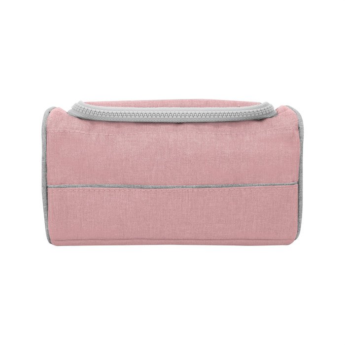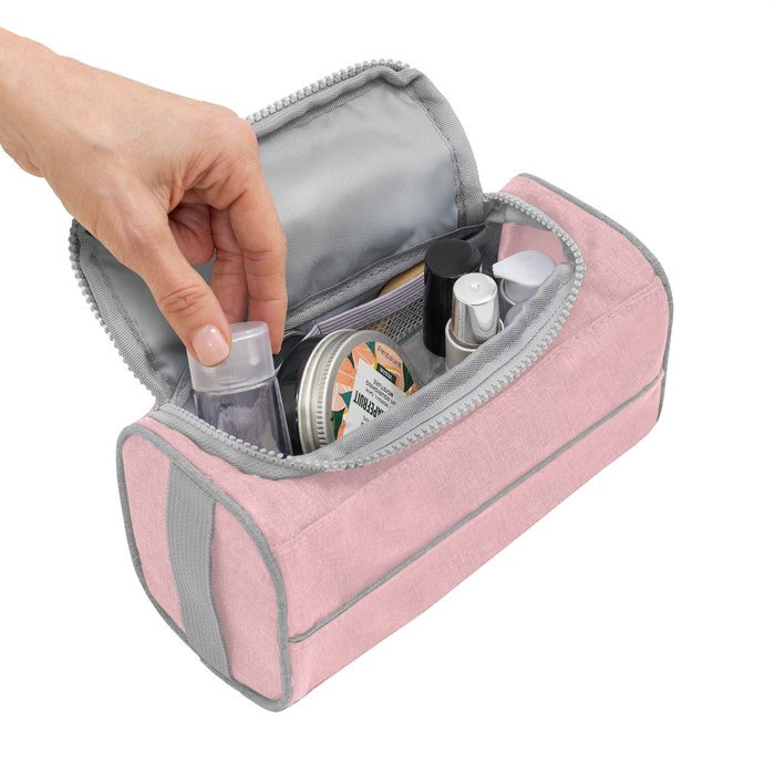 22 x 10 x 12 cm. Poliéster 300D bicolor. Necessaire con tapa. Organizador con dos bolsillos internos de red elastizados, tapa acolchada con cierre plástico color gris y asa lateral de tela color gris para transportar.