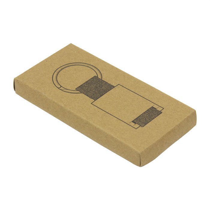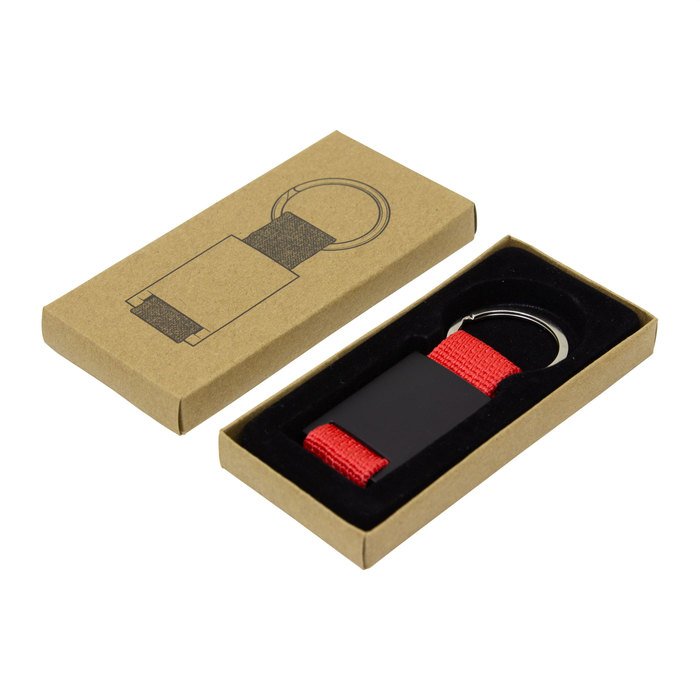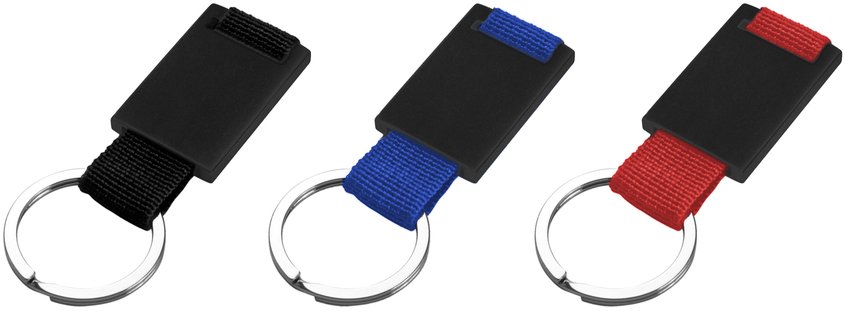 Llavero. Estructura metálica con aleación de zinc, terminación en negro mate. Correa de Polipropileno.