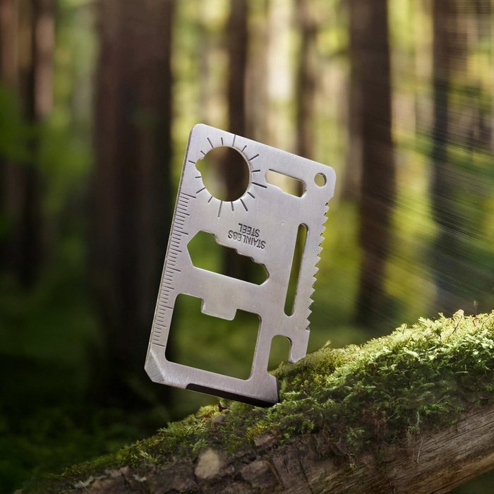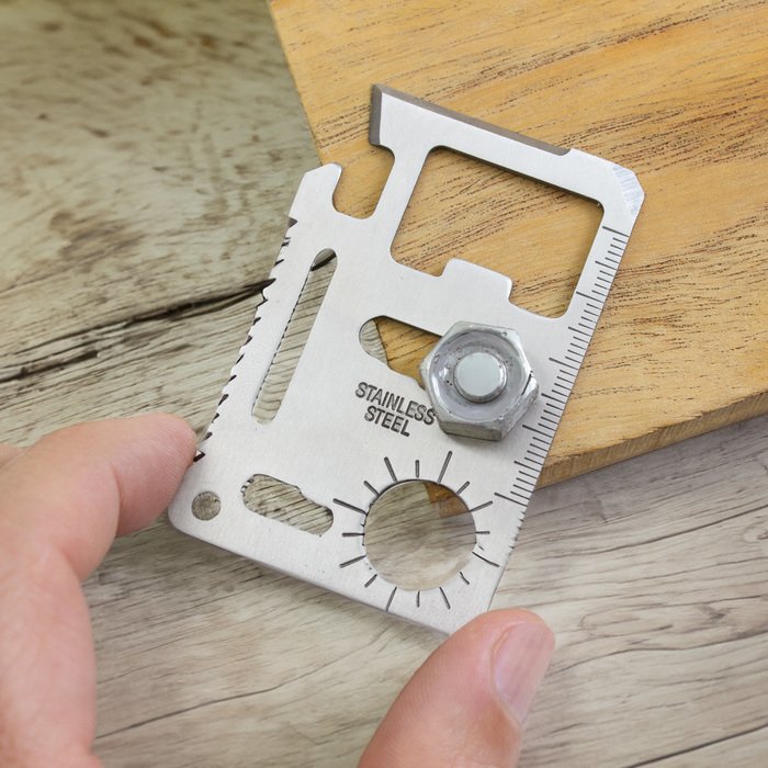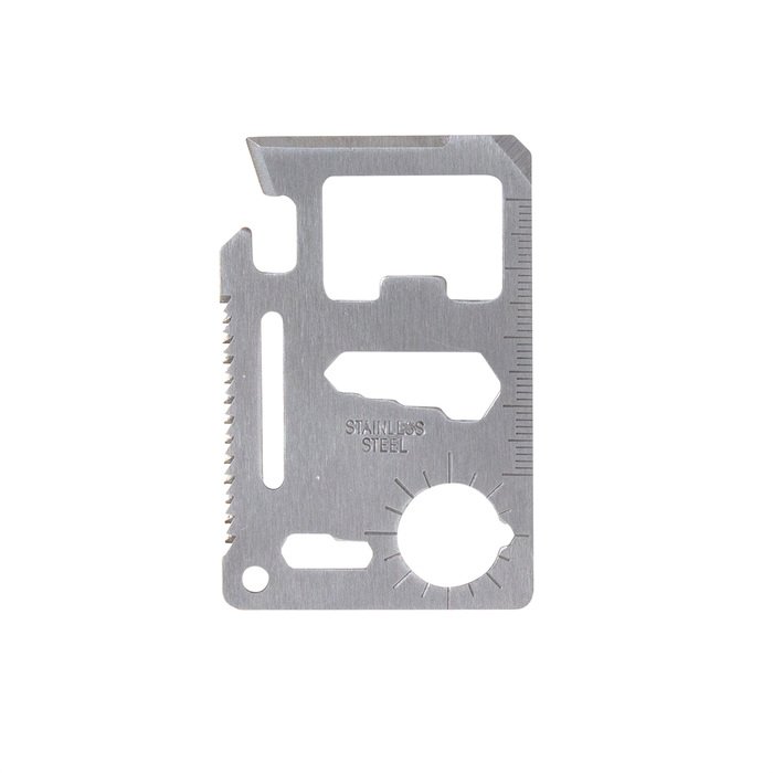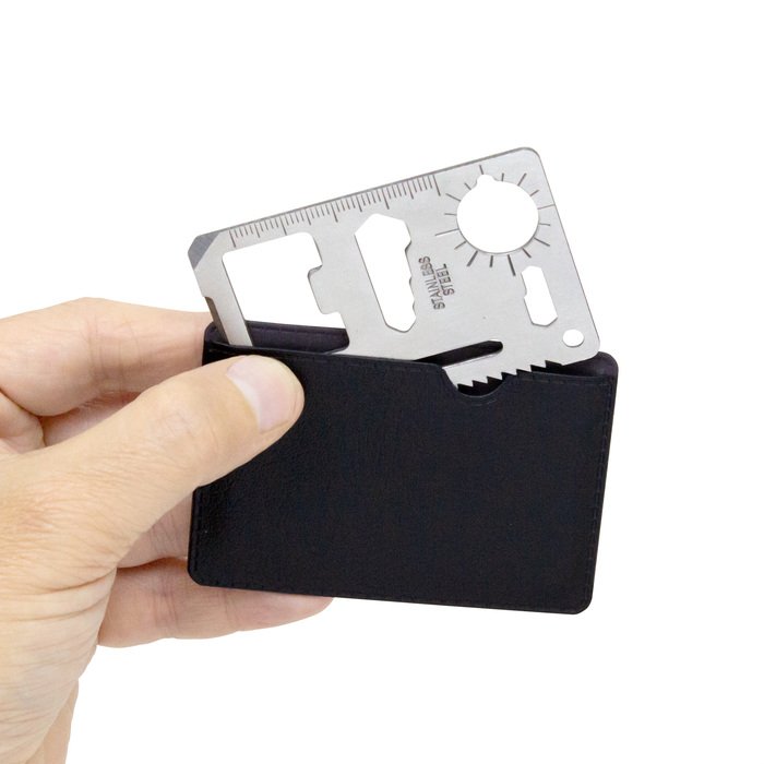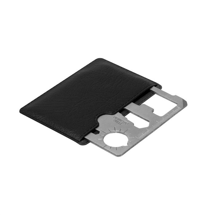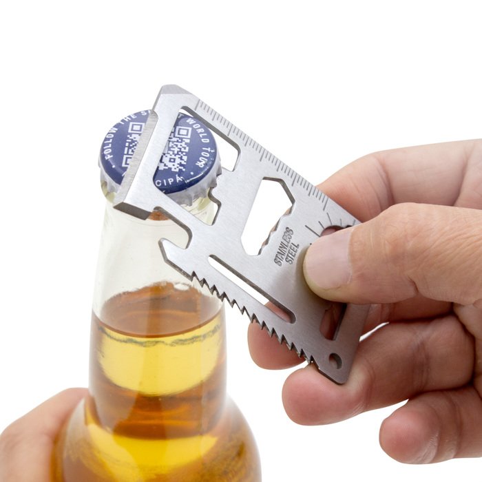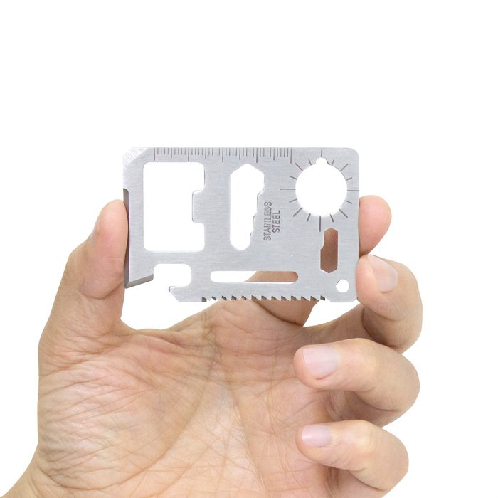 Tarjeta multiherramienta de supervivencia portátil. Concentra 11 funciones en 1: abrelatas, cuchillo, destornillador plano, regla, abridor de botellas, llave inglesa de 4 posiciones, llave mariposa, llave inglesa de 2 posiciones, calibre de ángulos / indicador auxiliar de dirección para navegación / brújula auxiliar, sierra y orificio para cordón o llavero.
