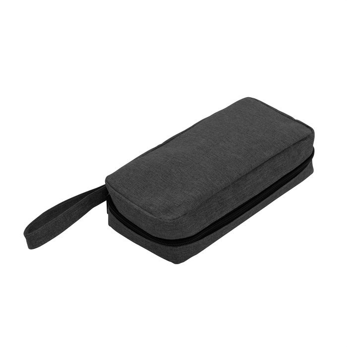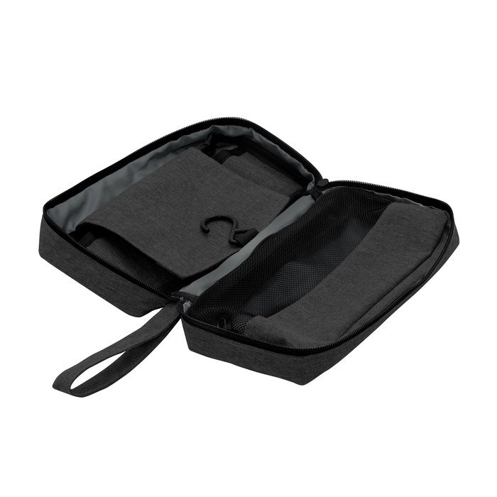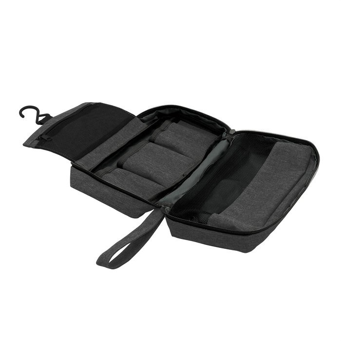 Necessaire colgante. Compartimento principal con cierre y asa de tela para transportar. Interior: compartimento superior rebatible con gancho para colgar y bolsillo de red con cierre, compartimento central con 3 bolsillos y amplio compartimento inferior con ventana de red y cierre.