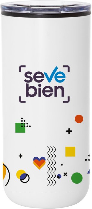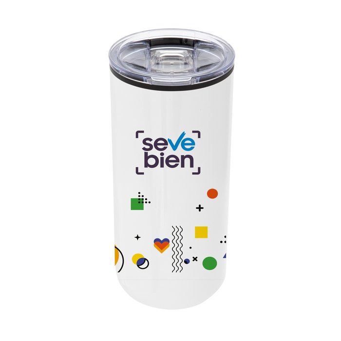 Mug doble pared. Interior en plástico y exterior de acero inoxidable 201. Tapa plástica transparente a presión con anillo de silicona. Base antideslizante.