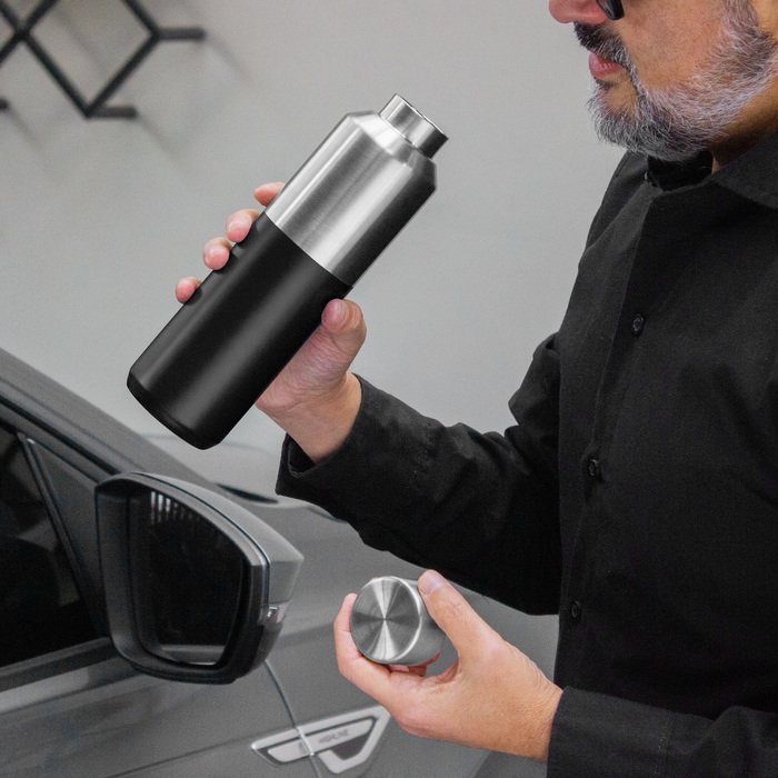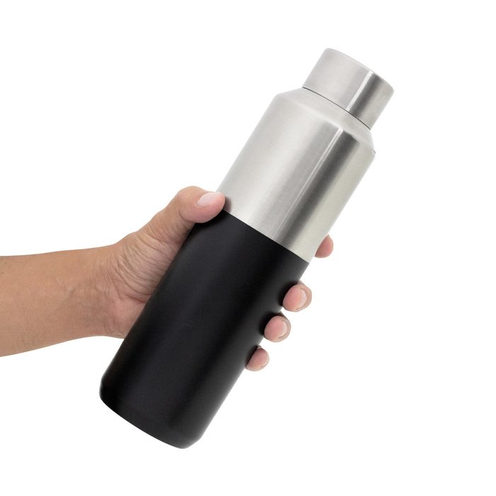 Botella doble pared, sellada al vacío. Interior de acero 304 y exterior de acero 201. Tapa a rosca de acero 201 con anillo de silicona. Pintura acabado mate en parte inferior. Mantiene por más de 12 hs la temperatura de las bebidas calientes y 24 hs de las bebidas frías.