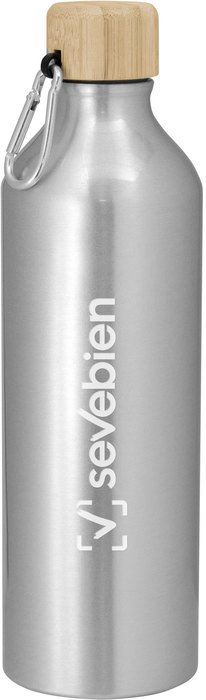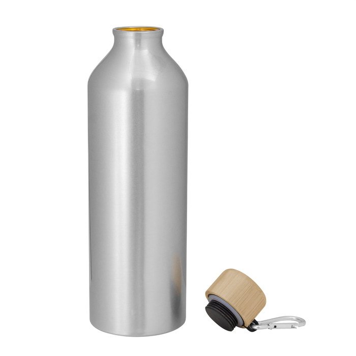 Botella de aluminio. Tapa a rosca de bambu con anillo de silicona y con mosquetón (gancho carabinero) en color plateado.