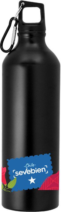 Botella de aluminio. Tapa a rosca plástica con anillo de silicona y con mosquetón (gancho carabinero) en color negro. Pintura color negro acabado mate.