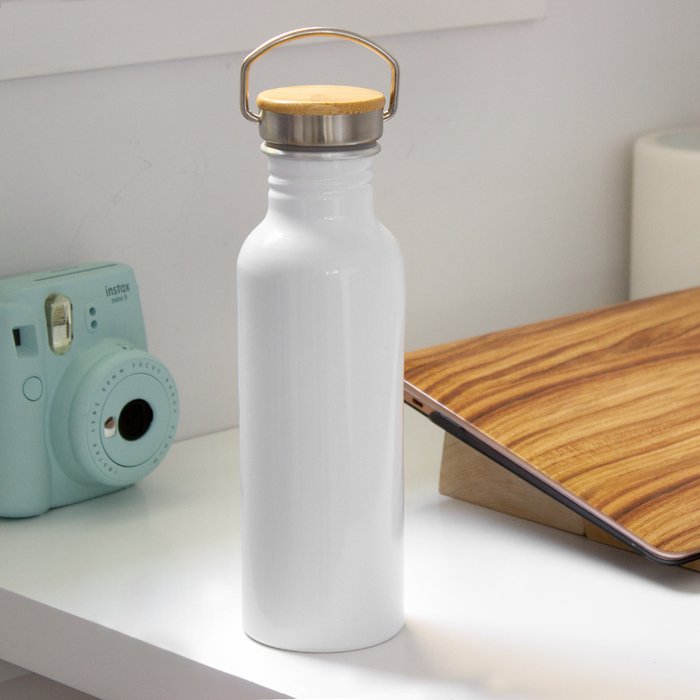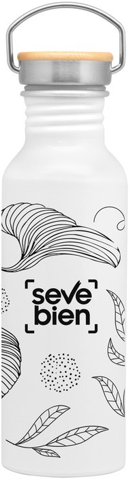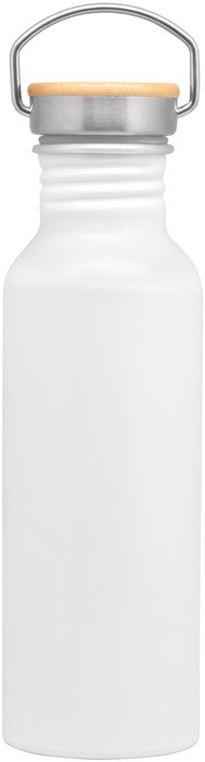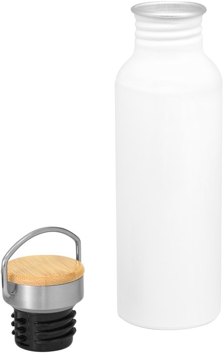 Botella de aluminio. Tapa metálica con detalles en bambú y manija de acero para ser transportada. Interior de la tapa en plástico con anillo de silicona antiderrame.