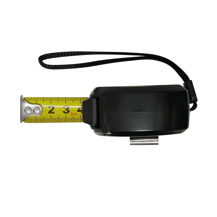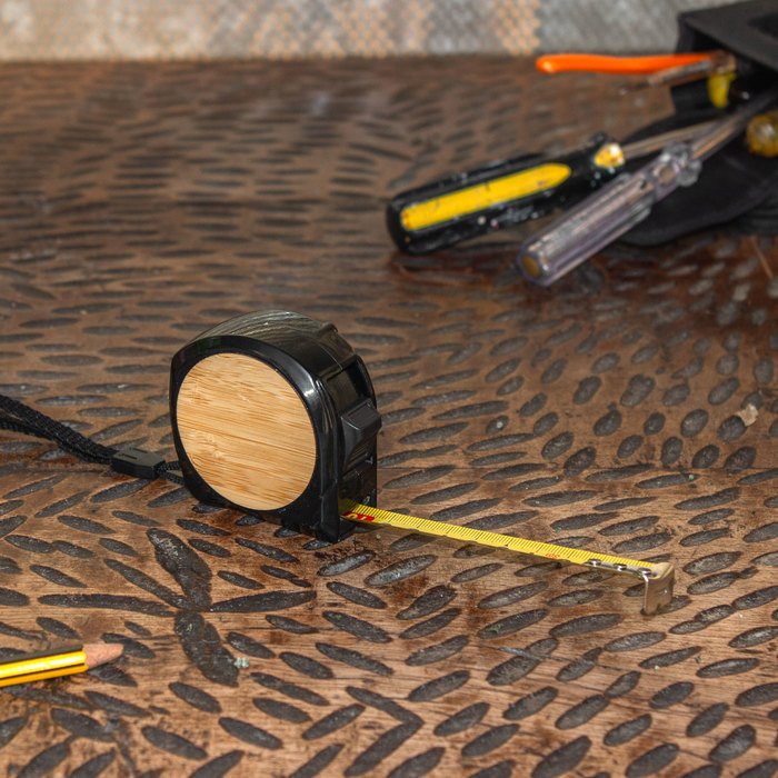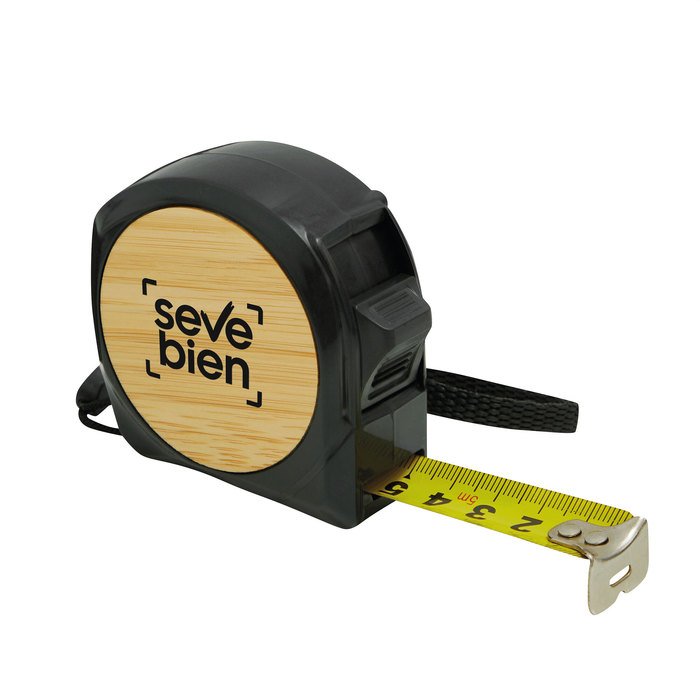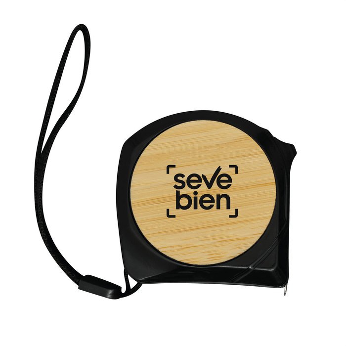 Cinta métrica. 3 metros de longitud. Cinta de acero inoxidable con traba de seguridad y clip sujetador metálico. Estructura de ABS con detalle circular en bambú. Correa de poliéster.