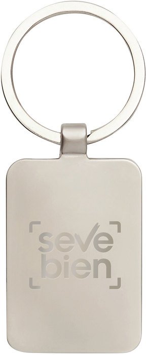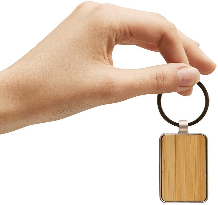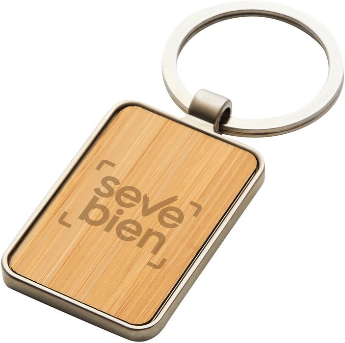 Llavero con forma rectangular. Estructura metálica con aleación de zinc con acabado brillante y panel frontal de bambú barnizado.