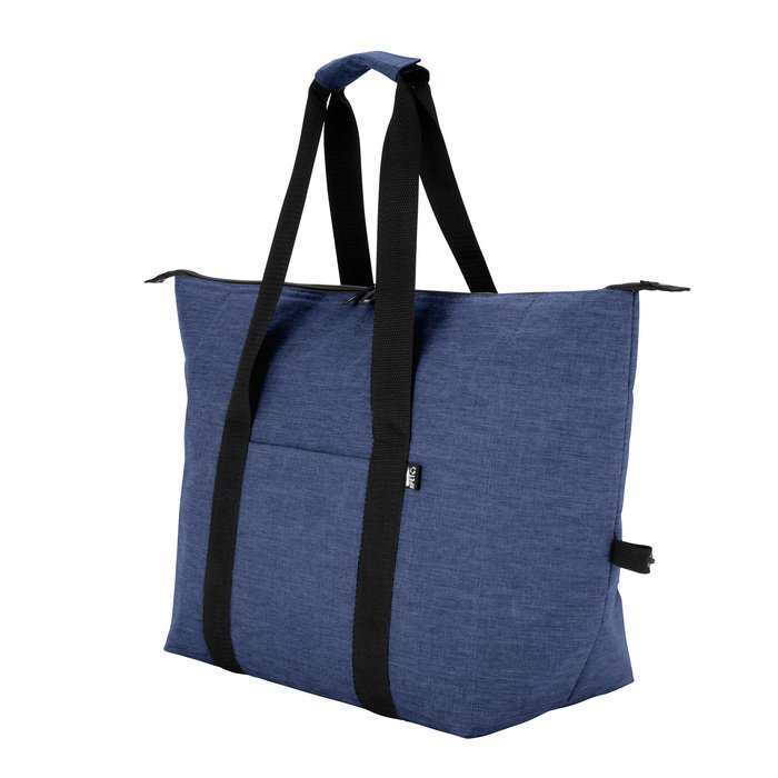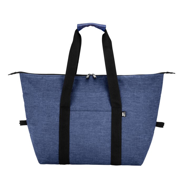 Bolso térmico. Cierre posterior con dos tiradores. Hebillas metálicas en los laterales que permiten cambiar su formato a prisma. Bolsillo frontal. Dos asas con refuerzo de velcro.