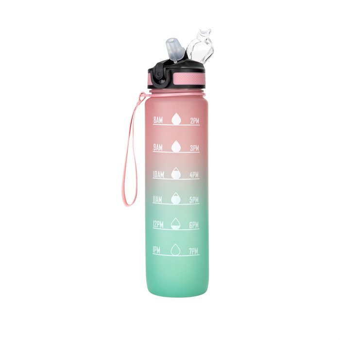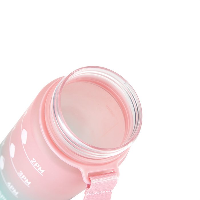 Botella con marcador de tiempo y medida. Colores pastel bitono en degradé con acabado frost. Tapa plástica combinada en color negro con un color de la botella. Apertura rápida, boquilla transparente rebatible y sorbete incluído. Correa del mismo color de la botella.